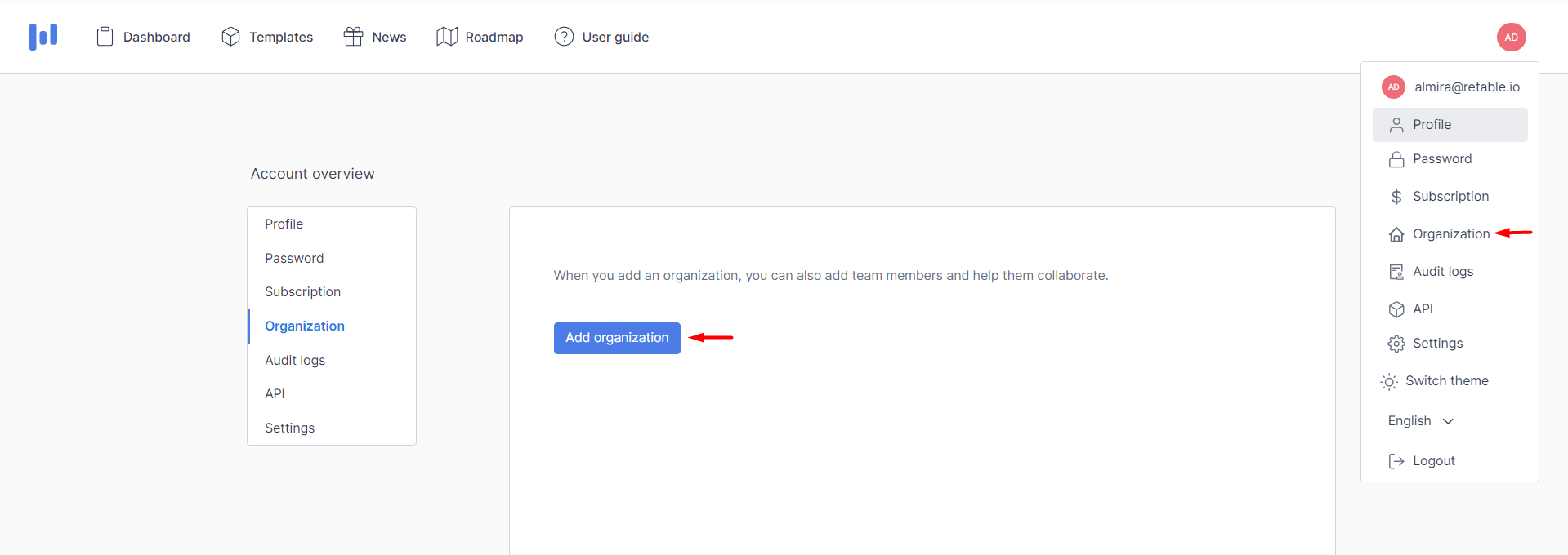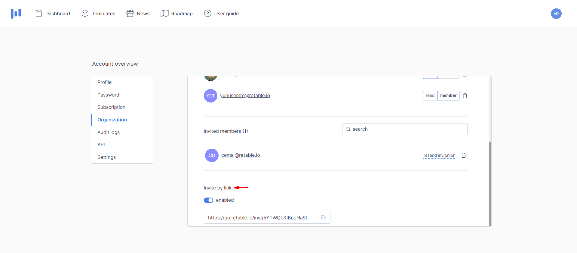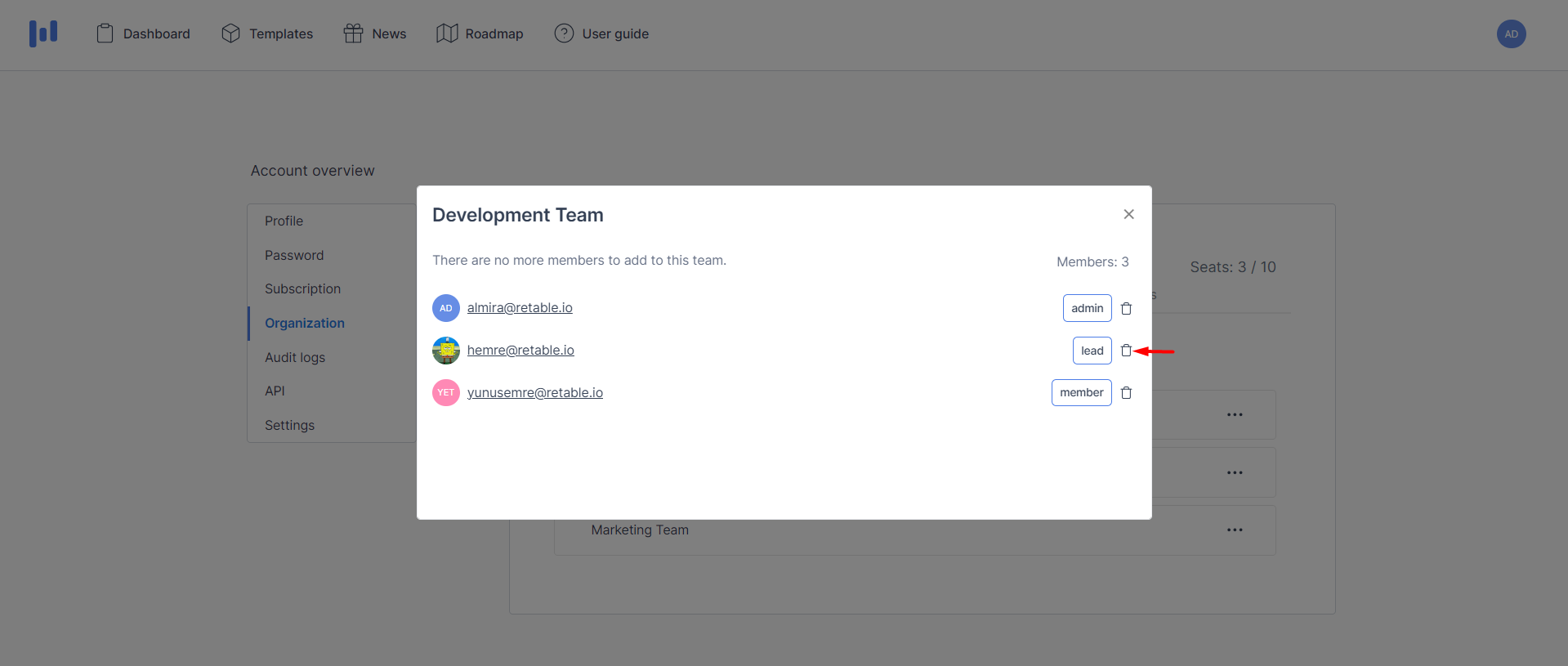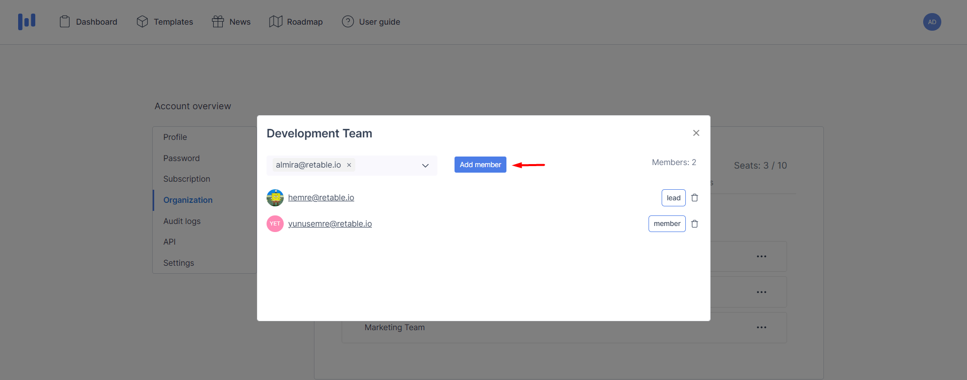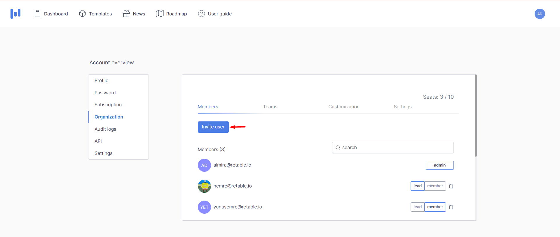 With Retable's organization features, you can collaborate with your teammates, and manage organization members.