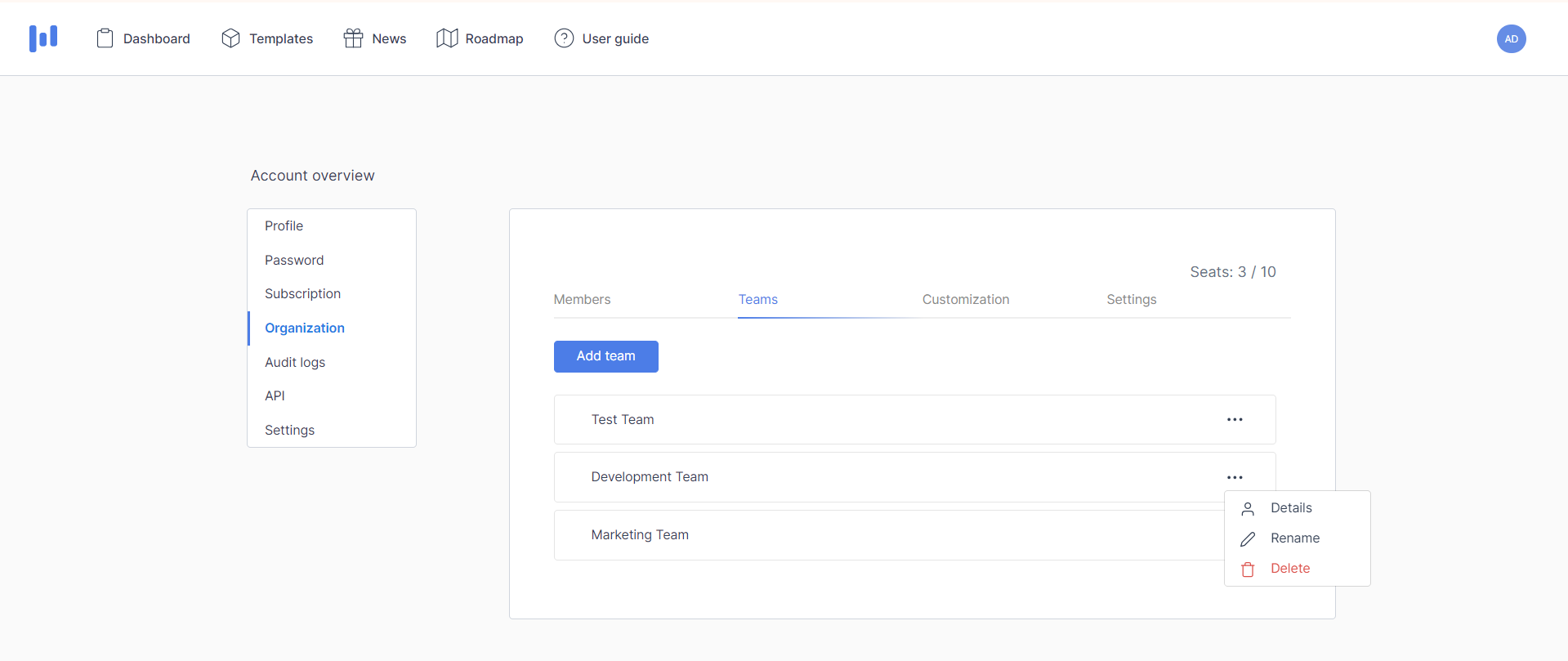 1. Click on the "Teams" tab in the menu and click "Add team".