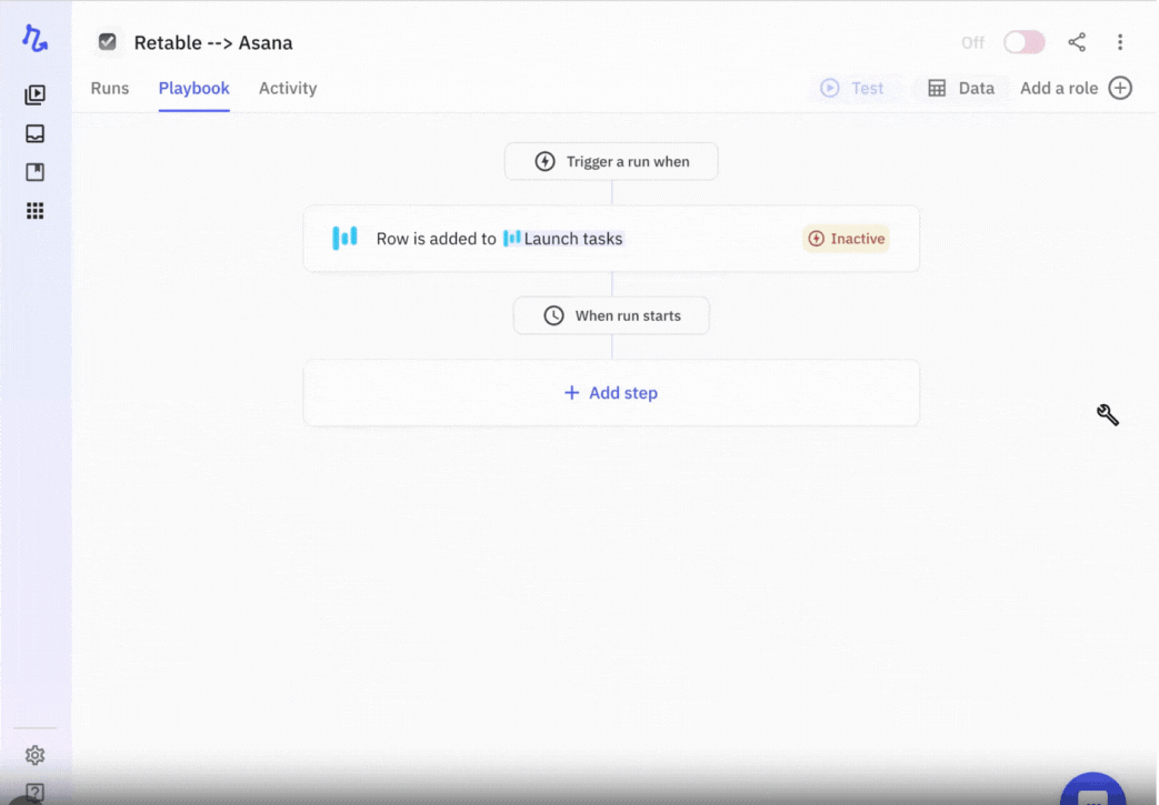 Finally, it's time to turn on your playbook. Just flip the On/Off toggle in the top-right to 'On', and your playbook will automatically trigger whenever a new row is added to the selected table in Retable.
