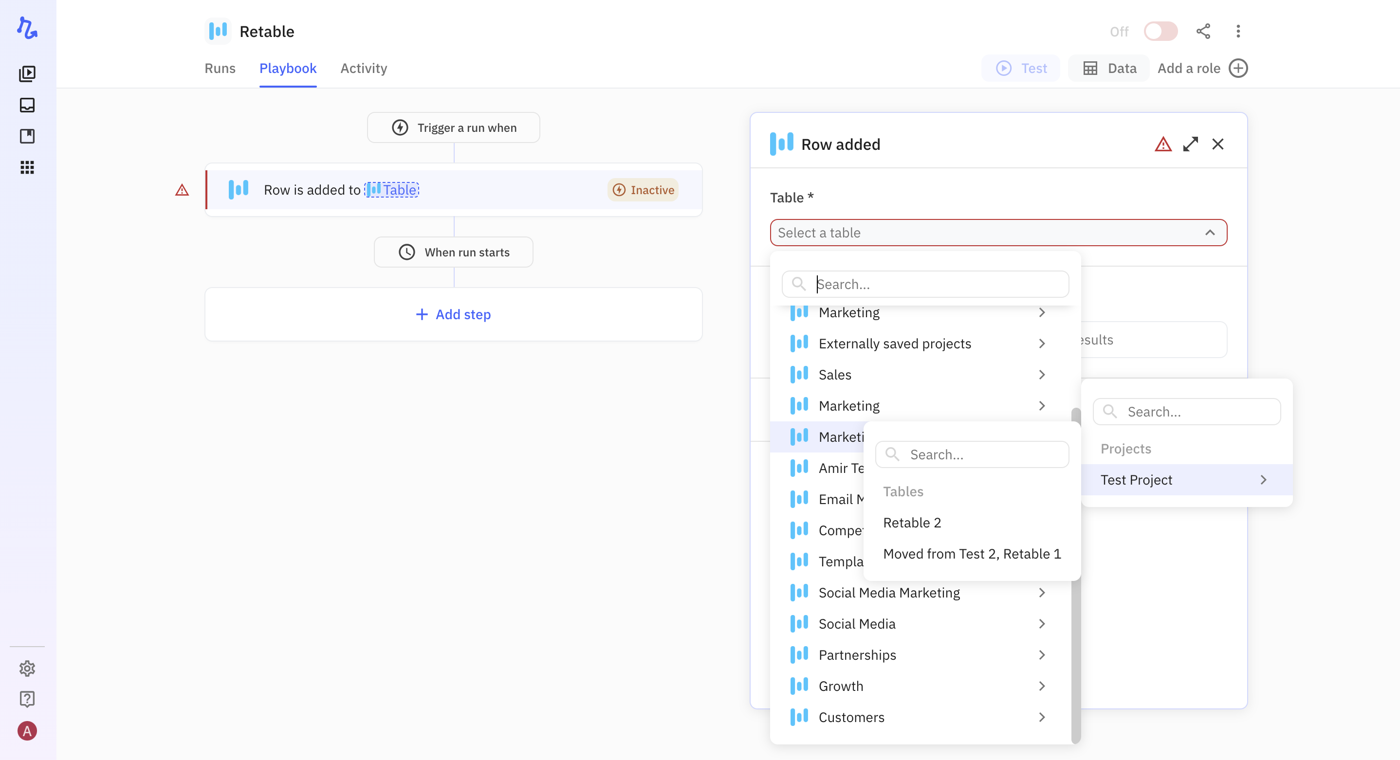 Every playbook starts with a trigger. The trigger detects changes in your connected apps and runs your playbook in response. Click "Add trigger" and select "Row added" under Retable. Then, select a specific workspace and a table within it. If this is your first time using a Retable integration in Relay, you'll be prompted to connect your Retable account. Now, whenever a new row is added to the selected table in Retable, your playbook will run automatically.
