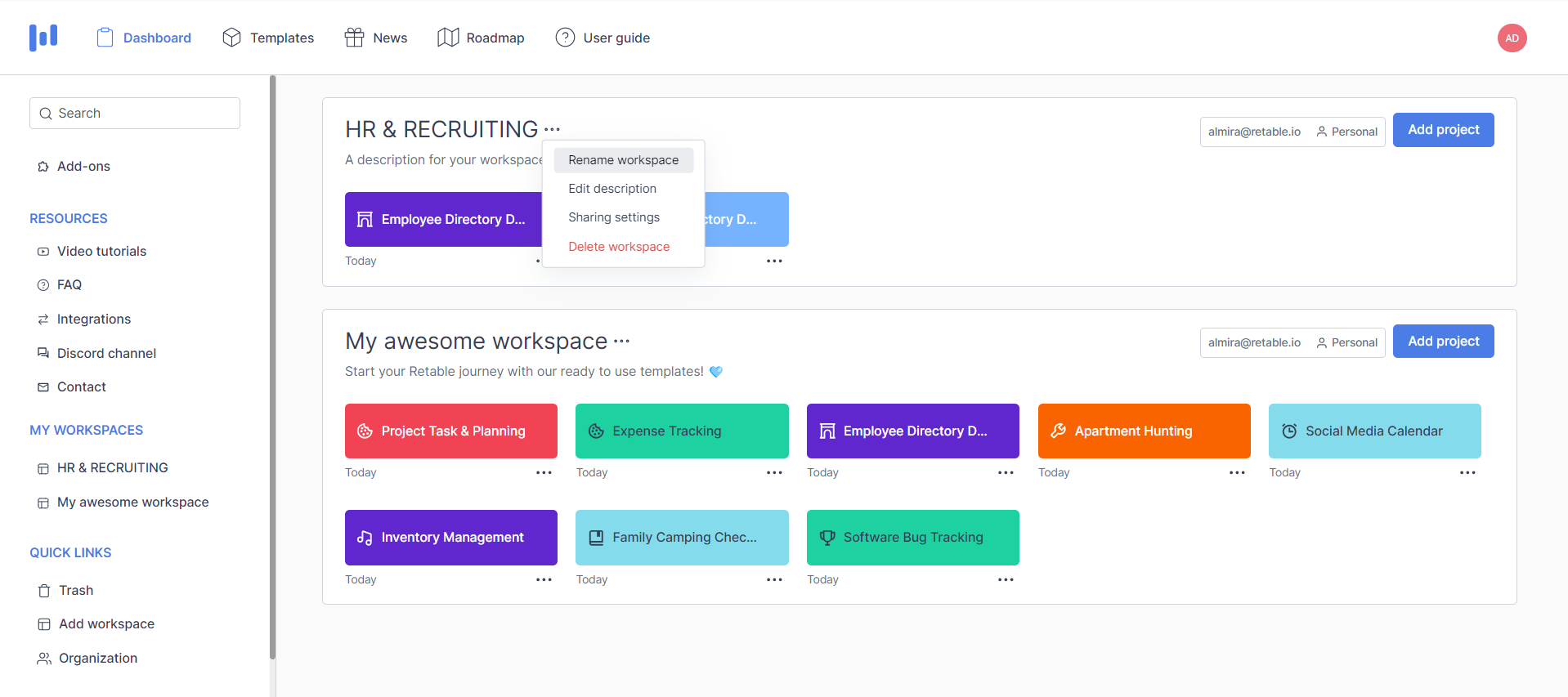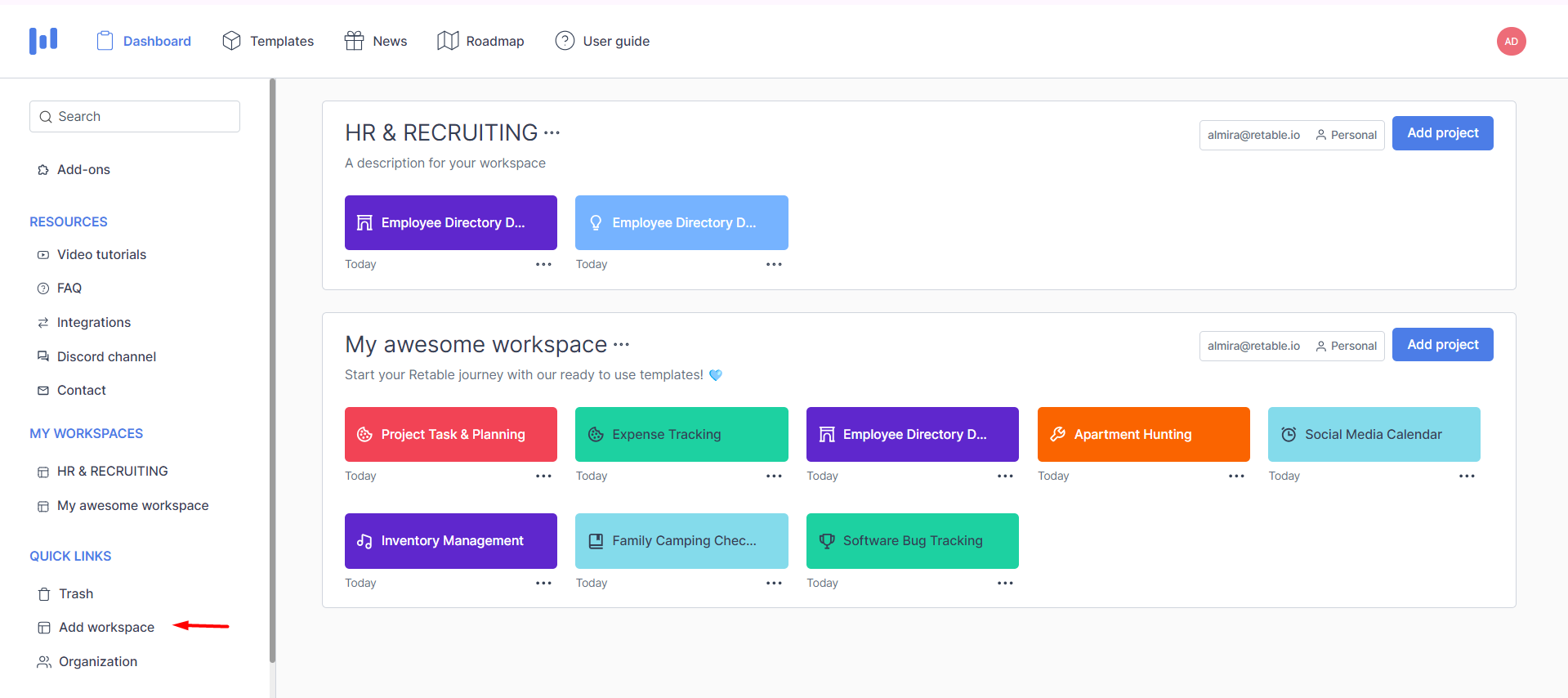 4. Click on "Add workspace" button.