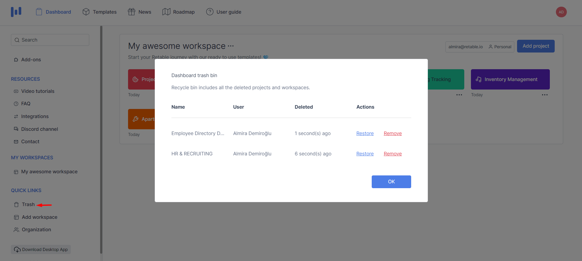 When you delete a workspace or a project it will be available in your trash. Deleted workspace or project can be restored from this trash.